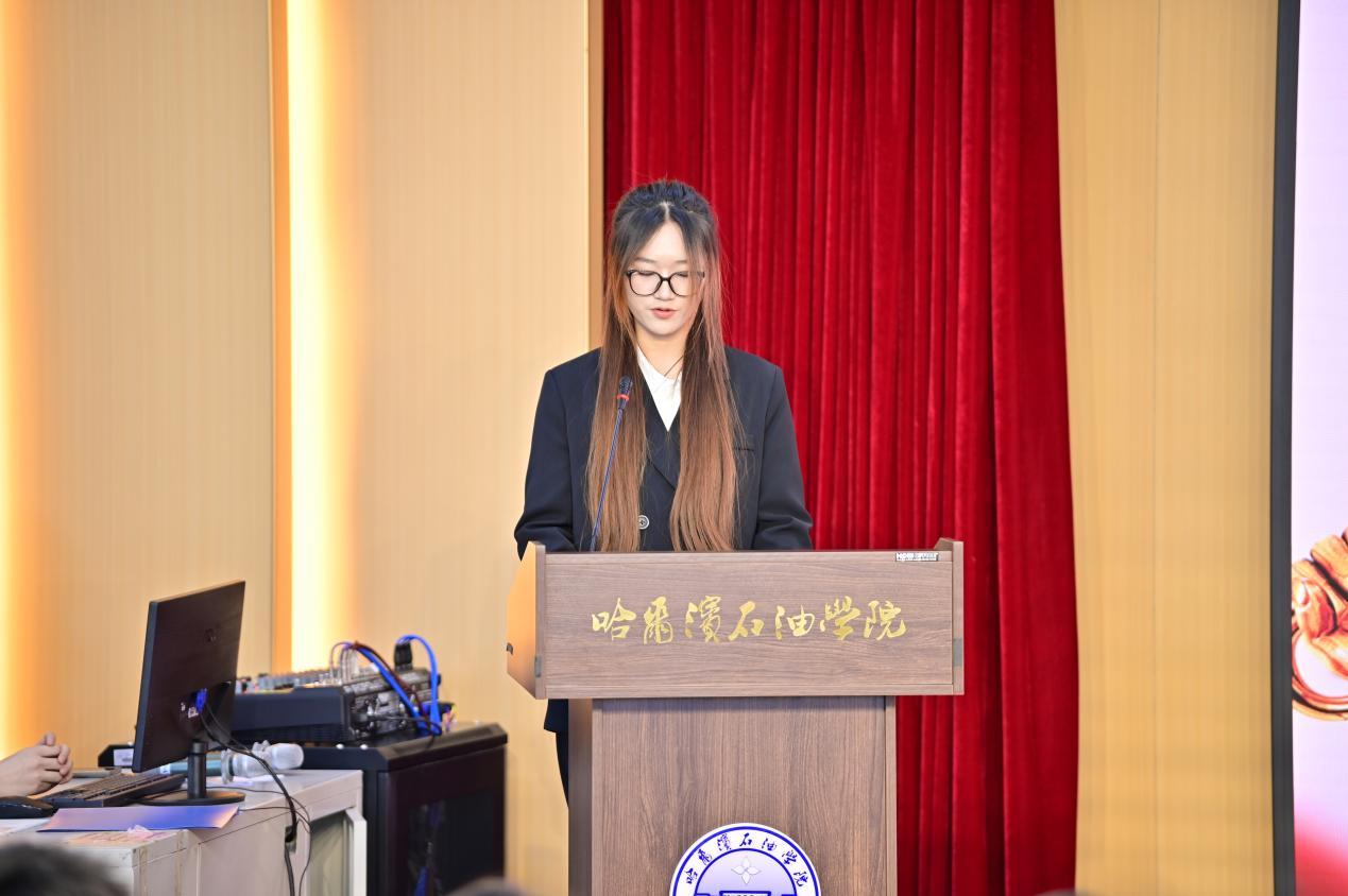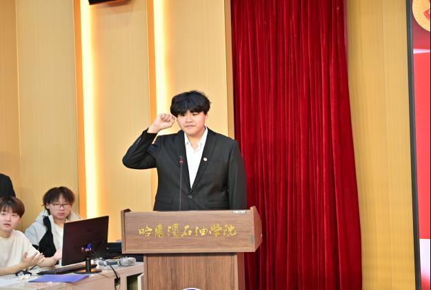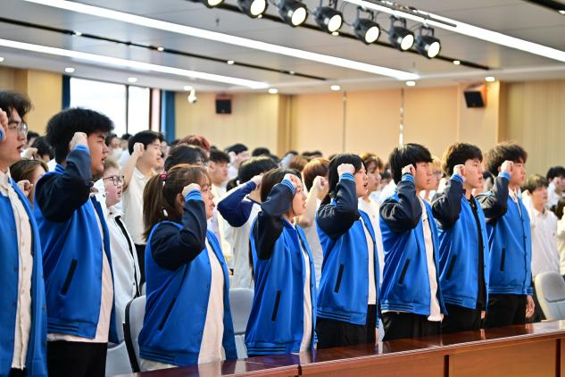 本次入团仪式在庄严的国歌声中拉开序幕,全体人员肃立,嘹亮的国歌激昂奏响,为青春奋进谱写了序曲,爱国情怀在会场中澎湃激荡。首先,由主持人现场宣读了2025年下半年新发展团员名单,随后,领誓人肖玥声音洪亮地领诵入团誓词,新团员们整齐地举起右拳,目光坚定地面向鲜红的团旗庄严宣誓。“我志愿加入中国共产主义青年团……”铿锵有力的誓词在会场中回荡,每一个字都饱含着青年学子对理想的执着信念与对未来的满腔热忱,全场寂静,唯有右拳紧握时衣袖的褶皱与团旗鲜红的底色相映,将这一刻的庄重与神圣定格在每个人心中。