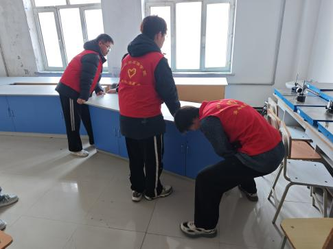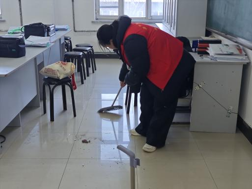 实验室内因长期开展实验课程,存在污渍顽固、杂物堆积等清洁难点。志愿者们手持抹布、扫帚、清洁剂等工具,不放过任何卫生死角:有的弯腰仔细擦拭,尽可能清除顽固污渍;有的蹲在地面清理角落的灰尘与碎渣,过程中,志愿者们分工协作、相互配合,大家始终保持高涨的热情,用实际行动诠释志愿精神。