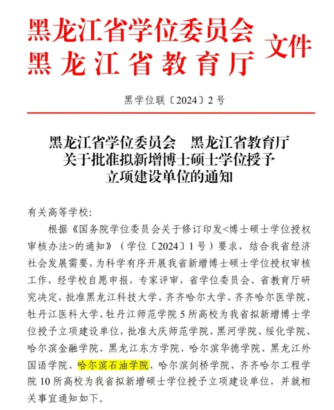 12月27日,黑龙江省学位委员会、黑龙江省教育厅联合发布了《关于批准拟新增博士硕士学位授予立项建设单位的通知》(黑学位联〔2024〕2号),我校成功获批硕士学位授予立项建设单位。