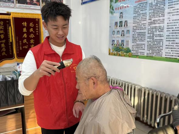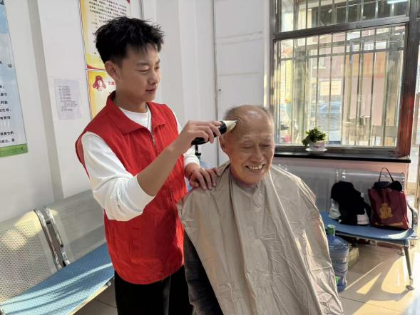 为了关注老年群体生活,哈尔滨石油学院人居环境学院青年志愿者协会于2025年10月14日在太阳城社区中为了开展“树敬老之风,促社会文明”主题志愿服务活动,帮助内行动不便的老人提供免费剃头服务,搬运生活物资,用实际行动传递青春温暖。