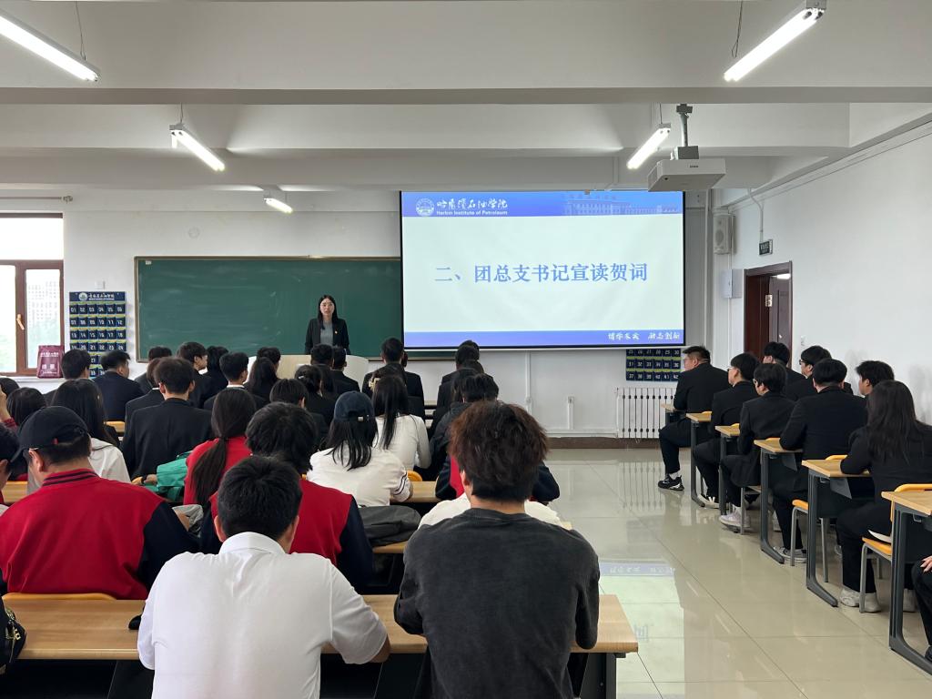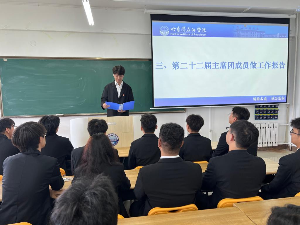大会第四项:学生代表纪芊羽宣读哈尔滨石油学院人居环境学院学生联合会章程。