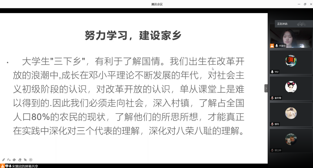 活力盛夏,青春无限。2020年8月10日8:30分,土木工程学院分团委在线上开展暑期“三下乡”社会实践活动宣讲会,2019级宋慧欣,高红婷两位同学在腾讯会议上为土木工程学院2019级160名居住在村镇的同学进行了暑期社会实践宣讲,介绍自己的实践心得。在线的同学讨论交流。本次活动主要是帮助村镇居住的同学了解到如何在家乡进行有针对性的社会实践,如何服务于家乡的建设,为家乡的发展贡献自己的力量。