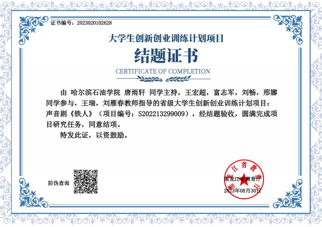 王瑞 指导学生项目声音剧《铁人》入选黑龙江省大学生创新创业训练计划项目 2023