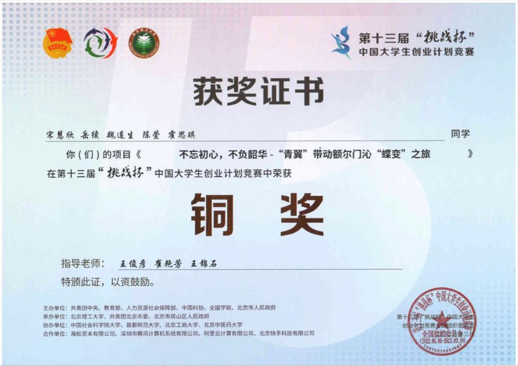王俊彦 指导学生作品获第十三届“挑战杯”中国大学生创业计划竞赛铜奖 2022