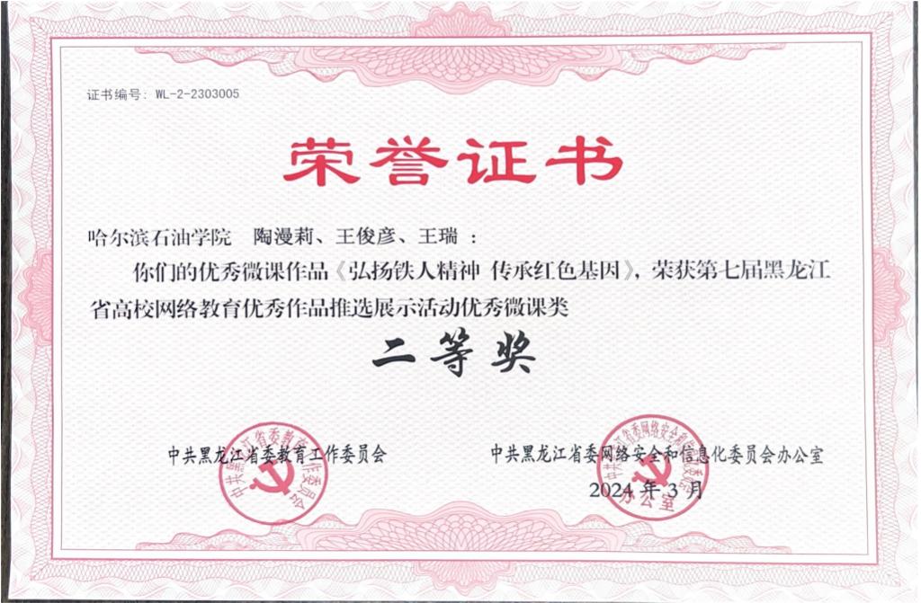 陶漫莉 《弘扬铁人精神 传承红色基因》获黑龙江省高校网络教育优秀作品推选展示活动二等奖 2024