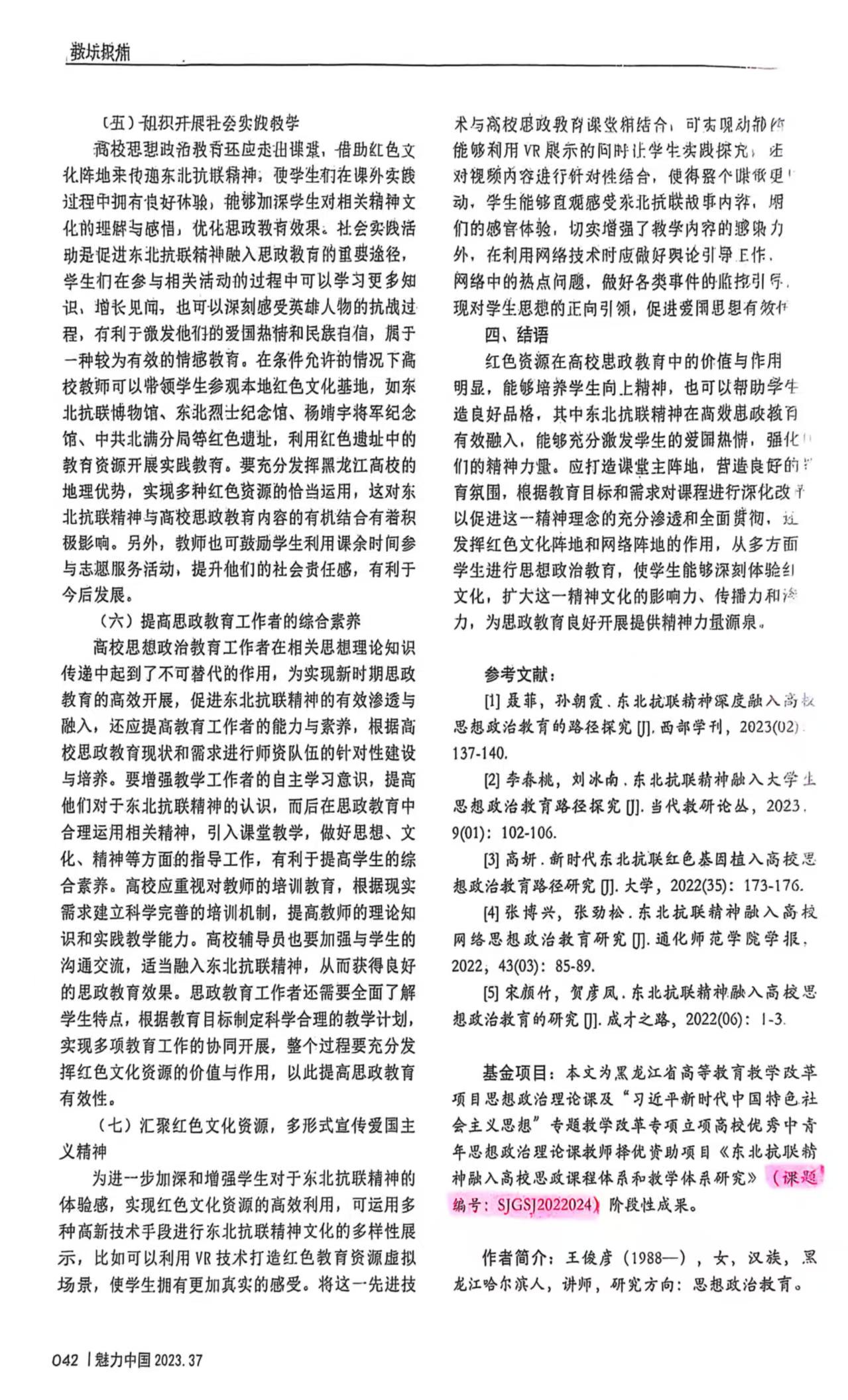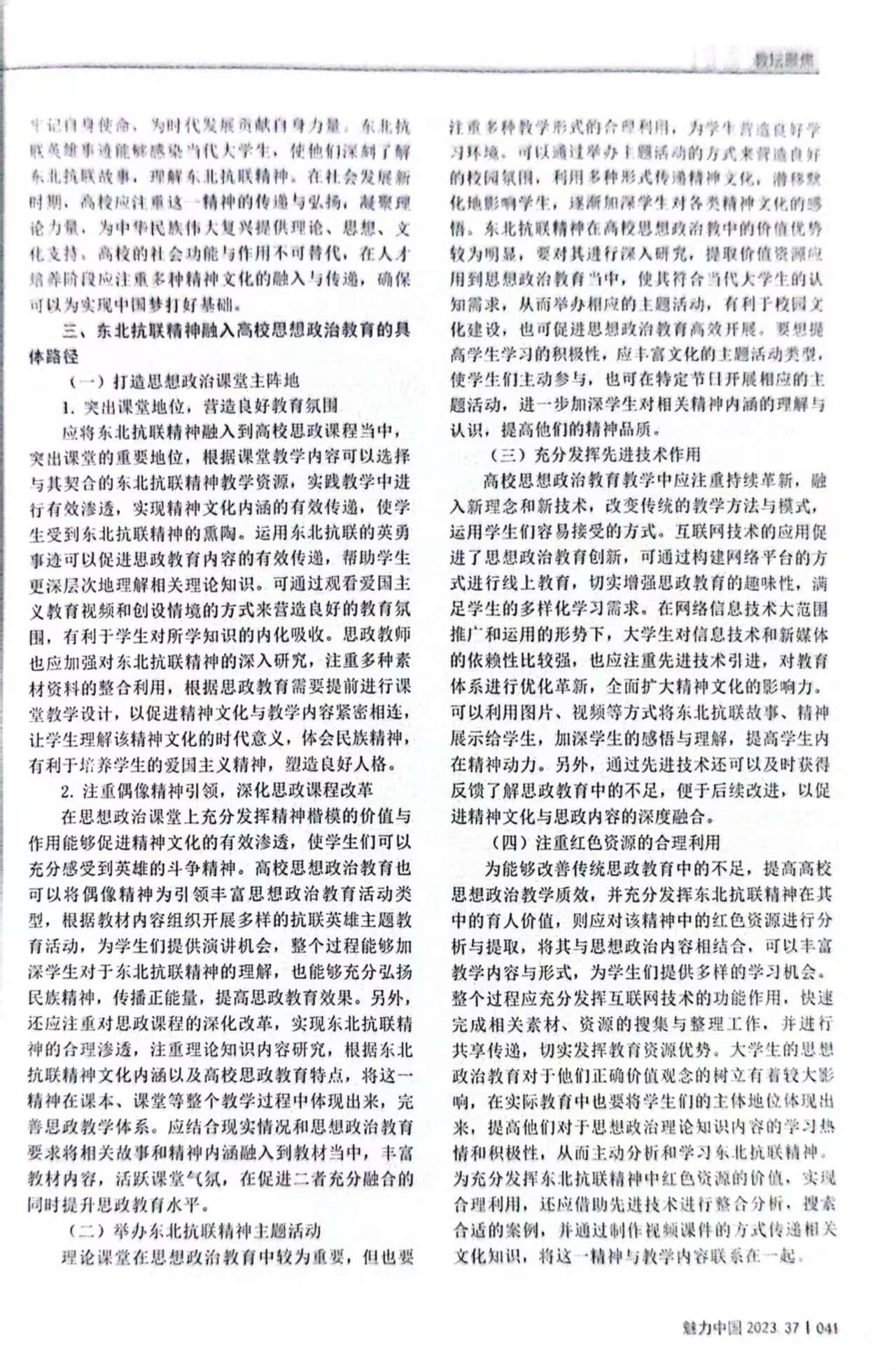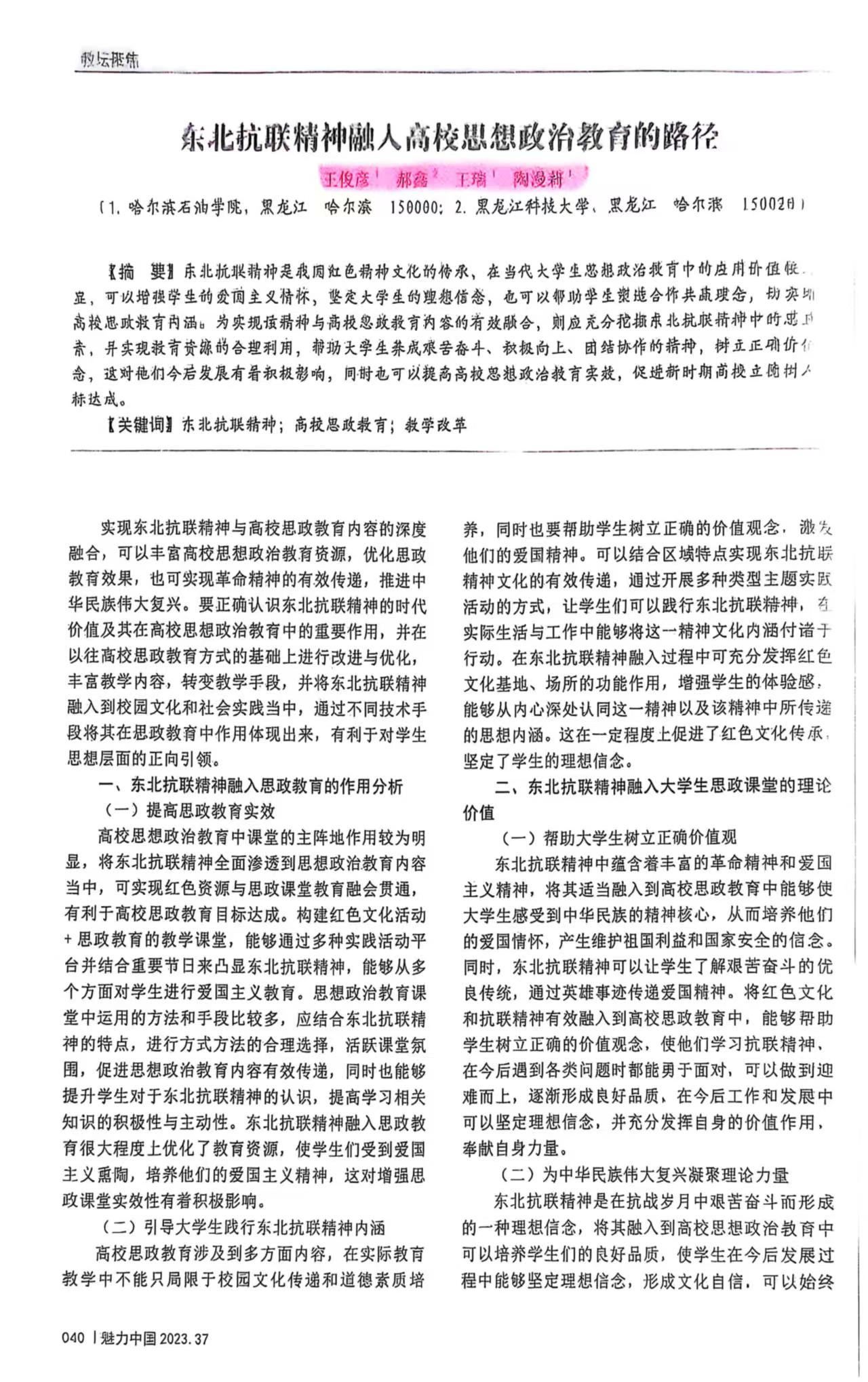 王俊彦 东北抗联精神融人高校思想政治教育的路径 魅力中国 2023