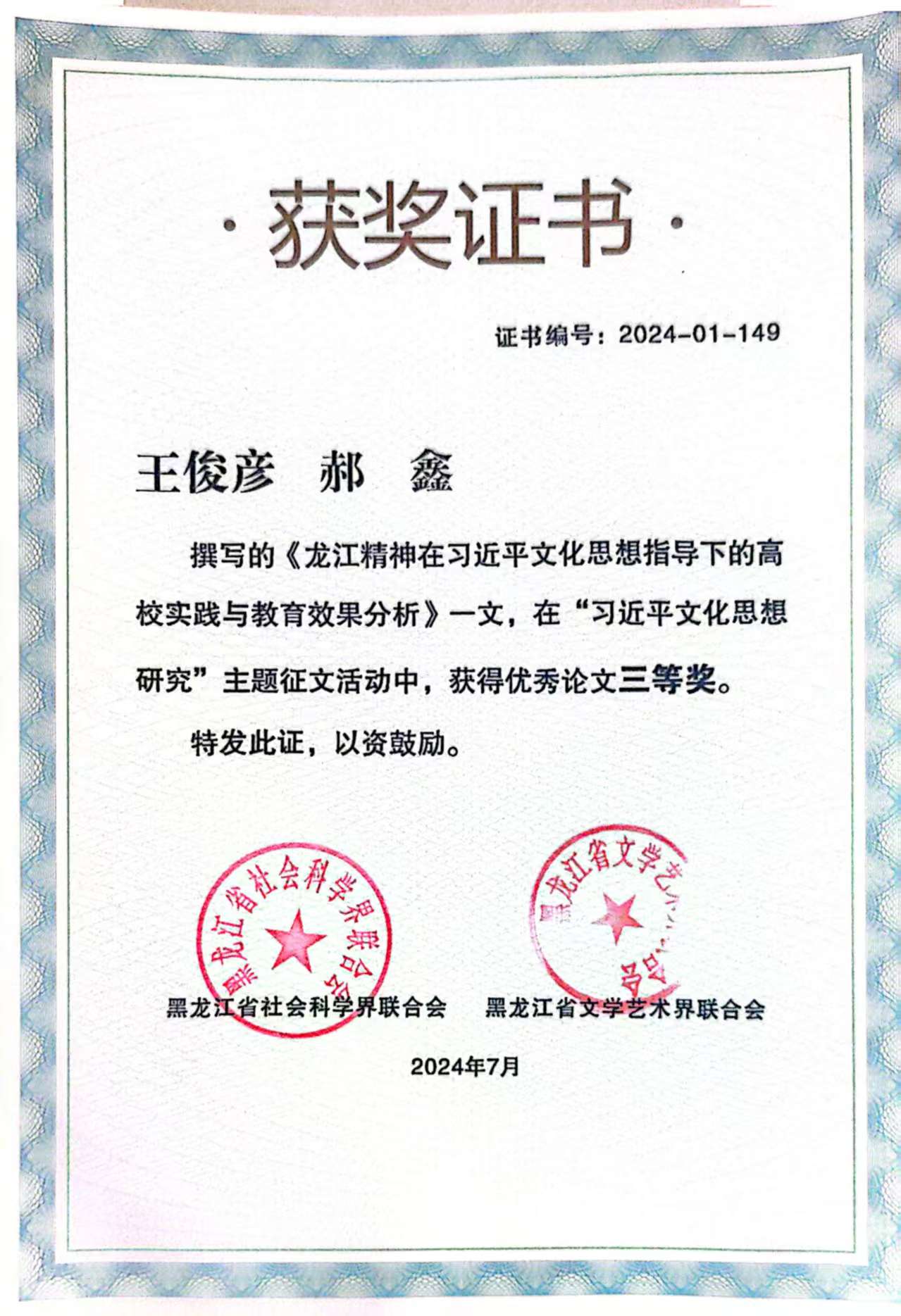 王俊彦 “习近平文化思想研究”主题征文活动三等奖 黑龙江省社科联 黑龙江省文联 2024