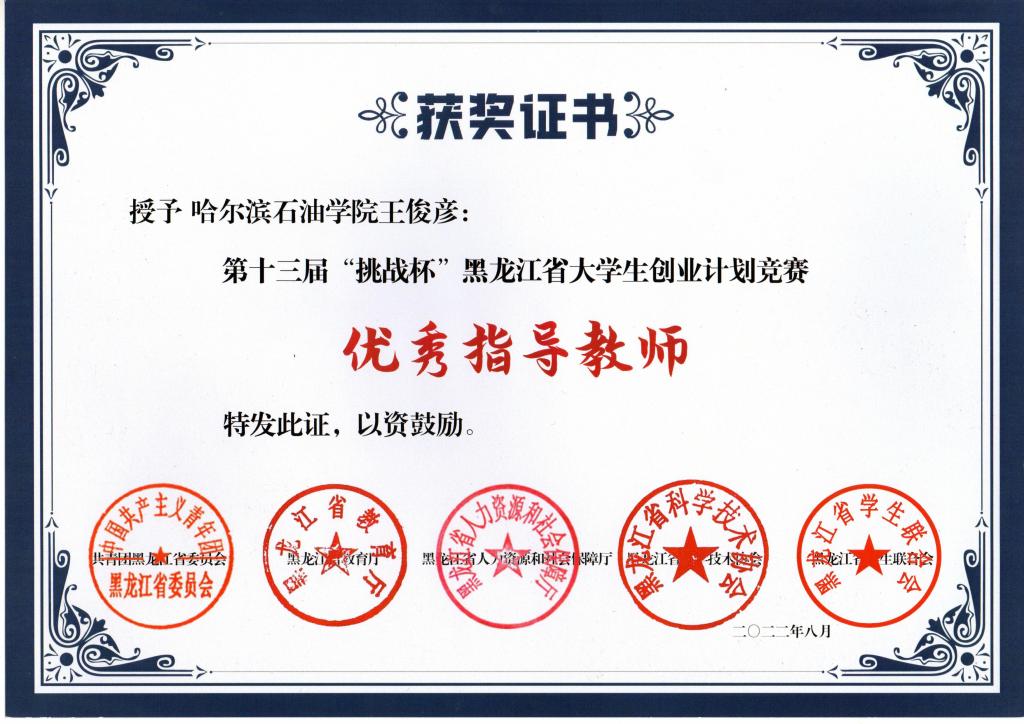 王俊彦 第十三届“挑战杯”黑龙江省大学生创业计划竞赛优秀指导教师 2022