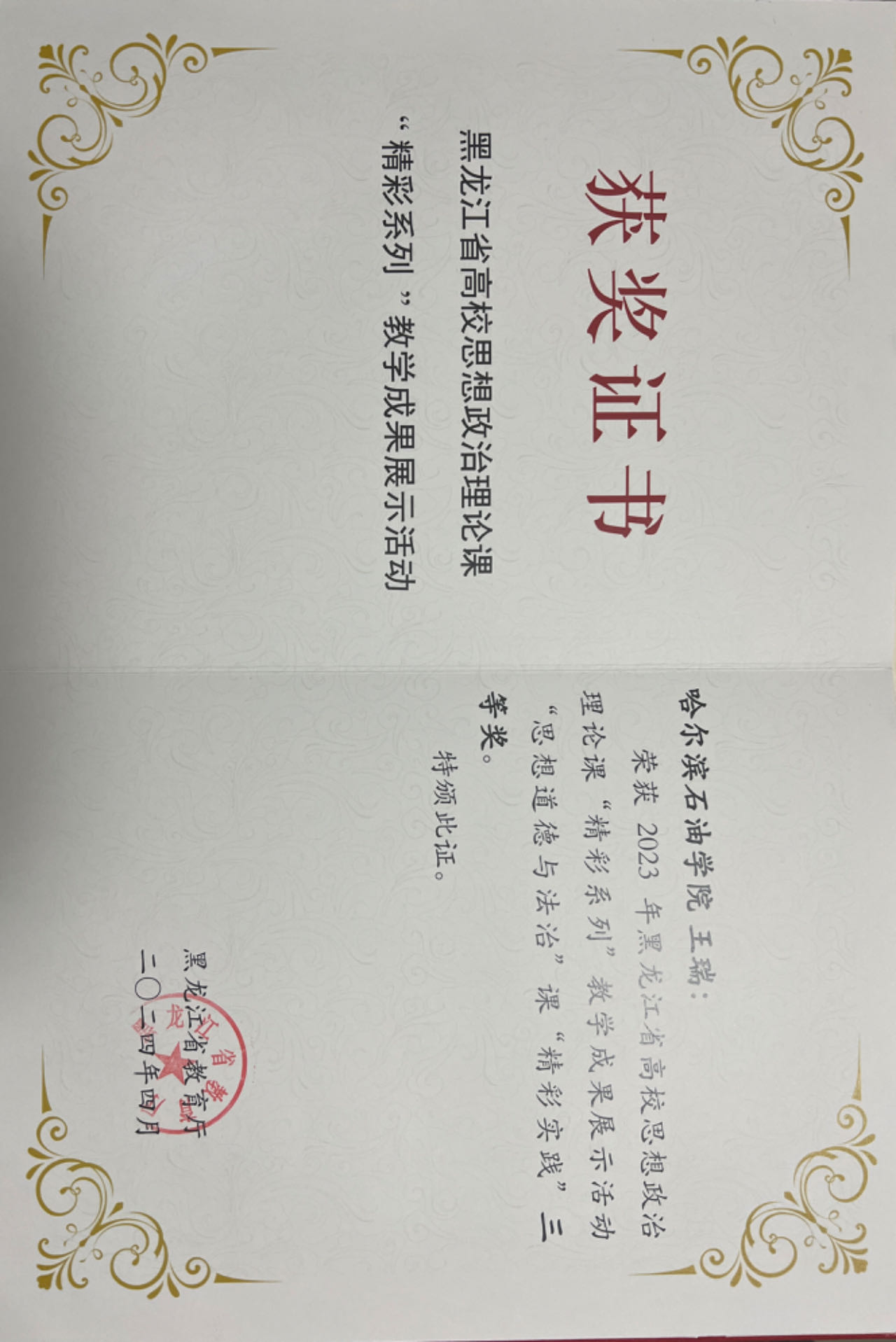 上一条:王瑞 《承大庆精神立德 以铁人榜样树人》首届黑龙江省民办学校党建和思想政治工作优秀成果二等奖 2023 下一条:陶漫莉 黑龙江省高校思想政治理论课“精彩系列”教学成果展示活动三等奖 2024年