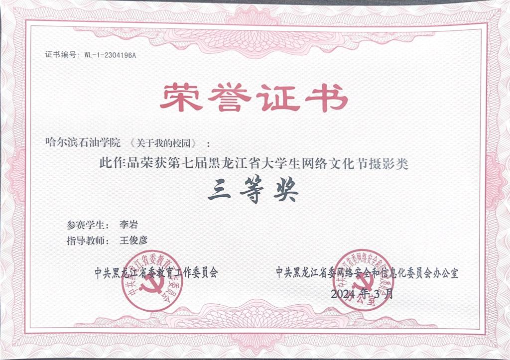 王俊彦 指导学生作品获第七届黑龙江省大学生网络文化节摄影类三等奖 2024
