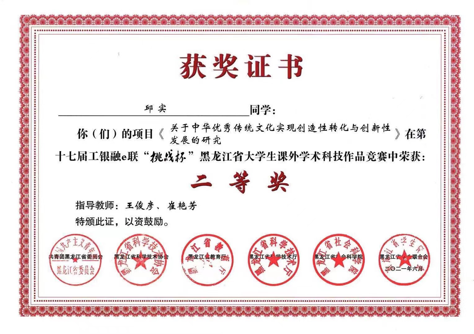 王俊彦 指导学生作品获第十七届“挑战杯”黑龙江省大学生课外学术科技作品竞赛二等奖 2021