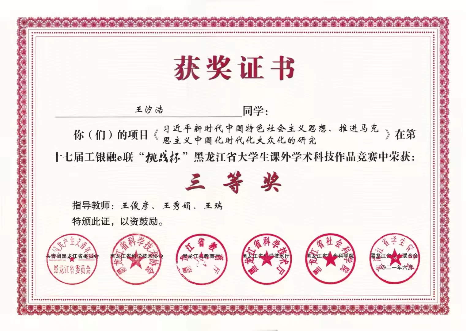 王俊彦 指导学生作品获第十七届“挑战杯”黑龙江省大学生课外学术科技作品竞赛三等奖 2021