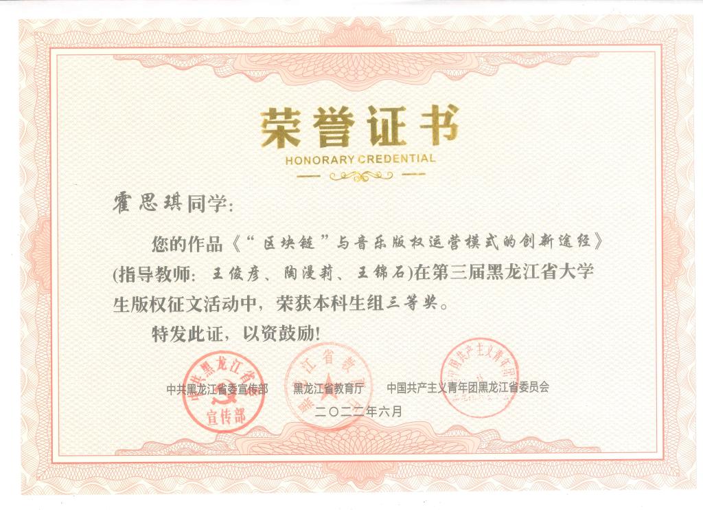 王俊彦 指导学生作品获第三届黑龙江省大学生版权征文活动三等奖 2022
