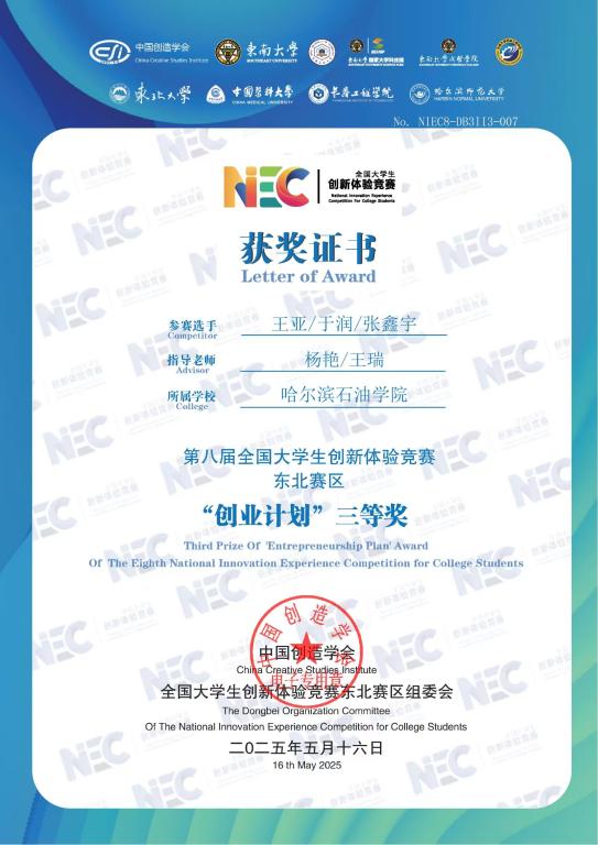 杨艳 指导学生参加第八届全国大学生创新体验竞赛,获得东北赛区“创业计划”三等奖