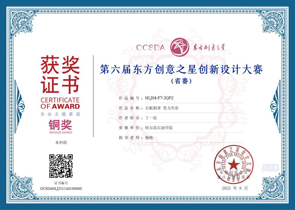 杨艳 指导学生作品”石板稻香 青力助农”获第六届东方创意之星创新设计大赛(省赛)铜奖