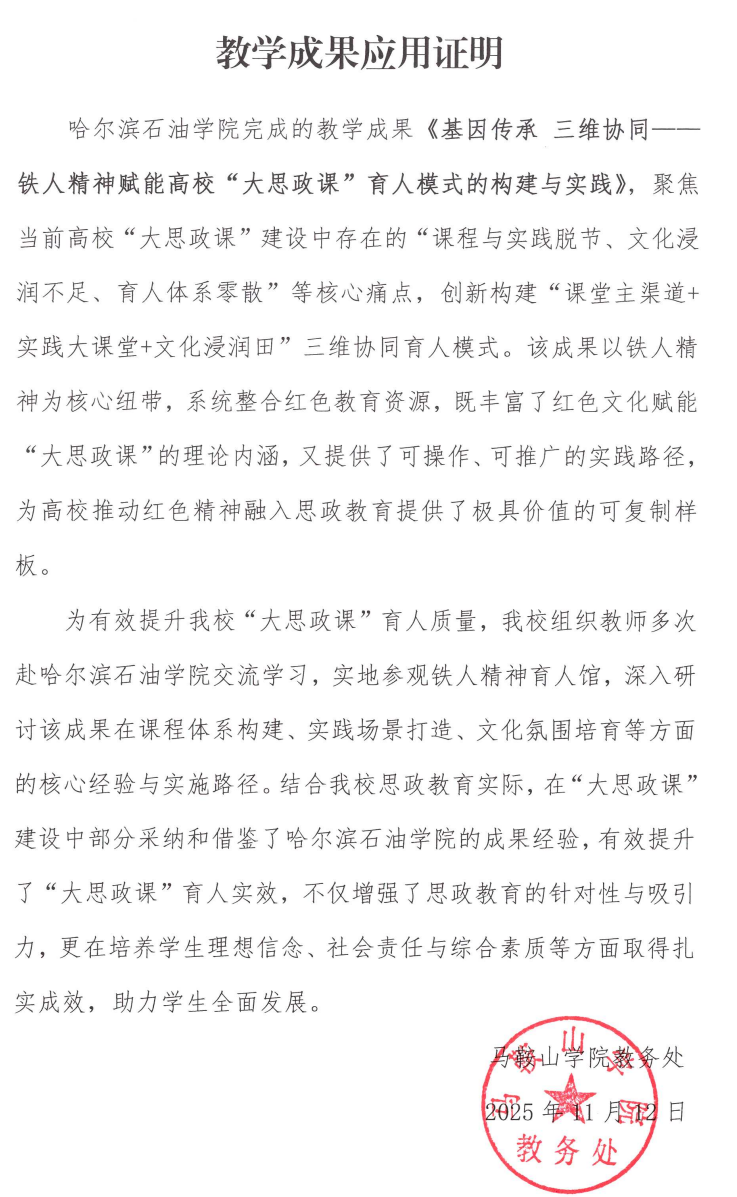 马鞍山学院 教学成果应用证明