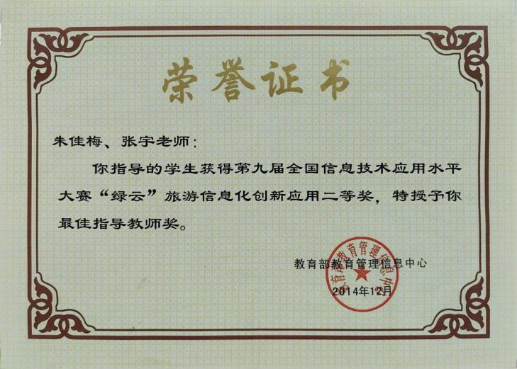 第九届全国信息技术应用水平大赛“绿云”旅游信息化创新应用最佳指导教师奖