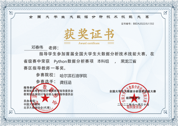 首届全国大学生大数据分析技术技能大赛黑龙江省优秀指导教师一等奖