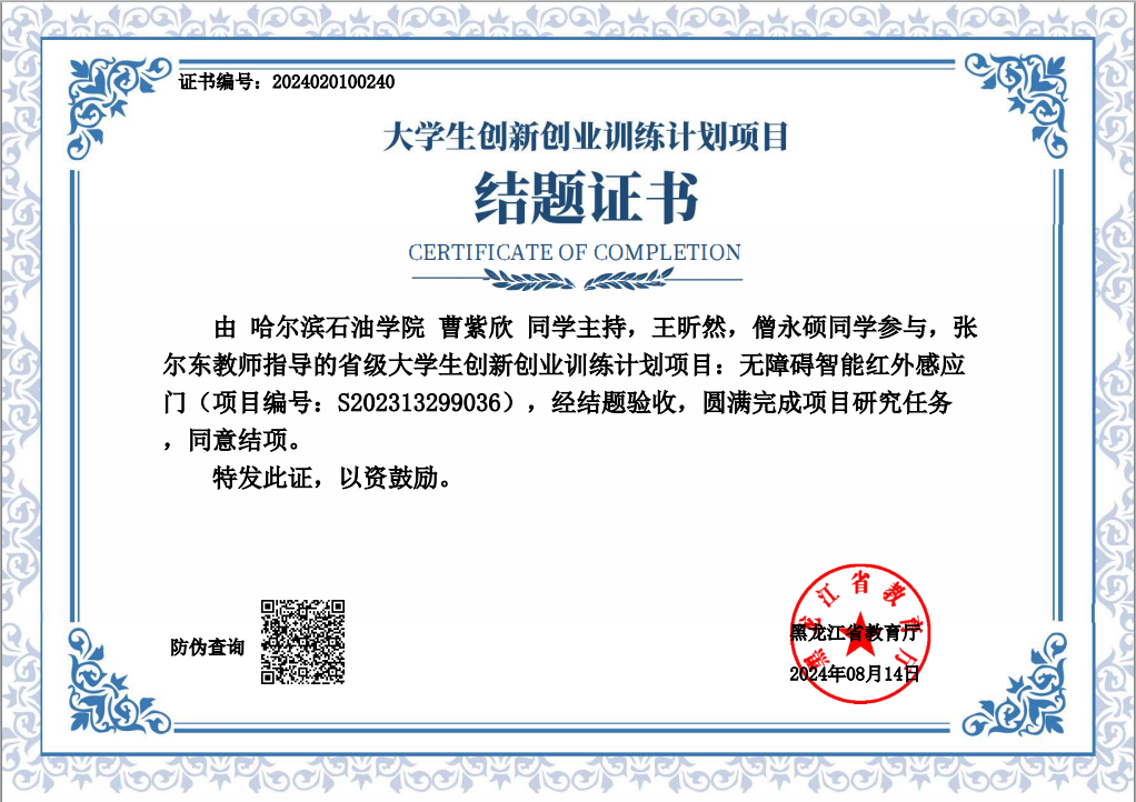 黑龙江省大学生创新创业训练计划项目《无障碍智能红外感应门》(2024.08)