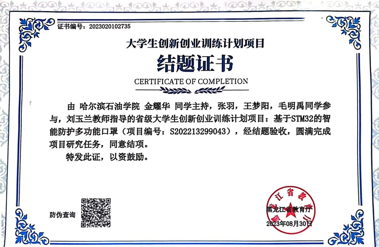 黑龙江省大学生创新创业训练计划项目《基于STM32的智能防护多功能口罩》(2023.08)