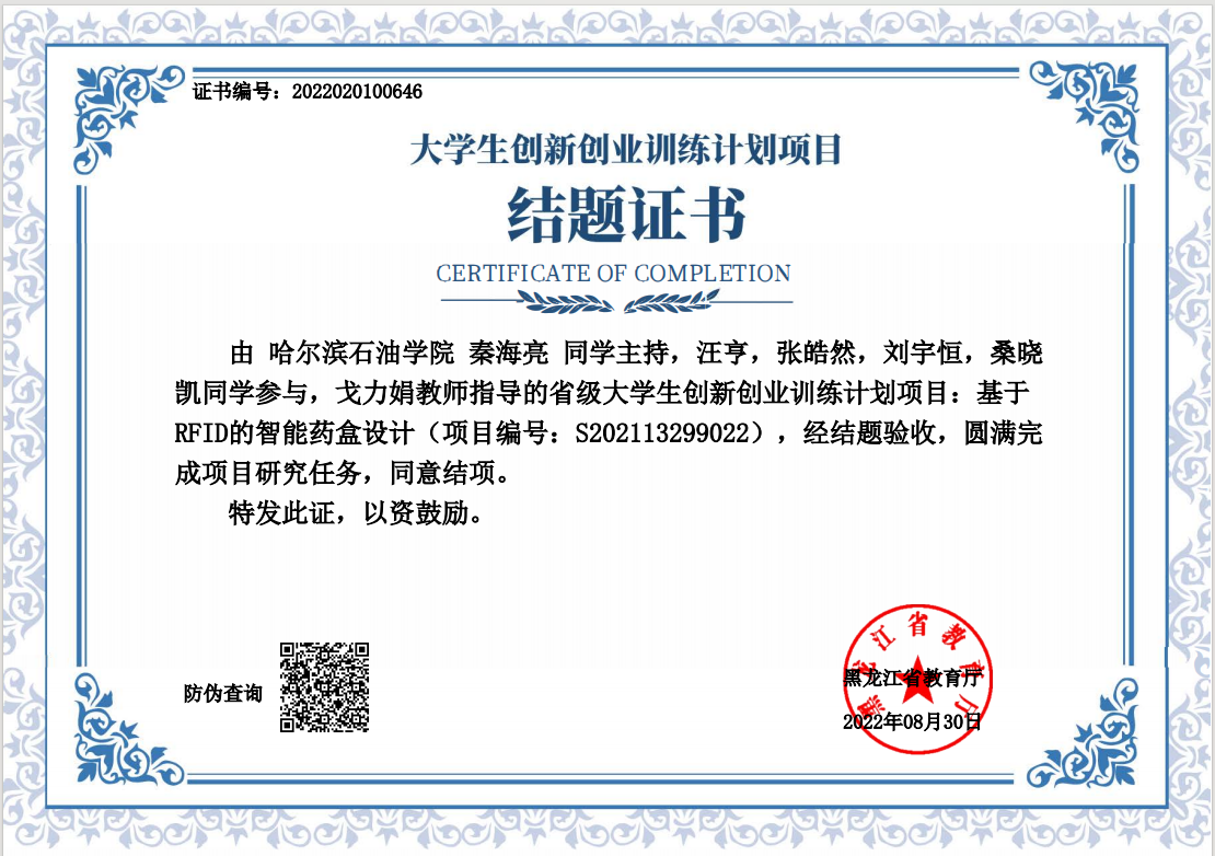 黑龙江省大学生创新创业训练计划项目《基于RFID的智能药盒设计》(2022.08)