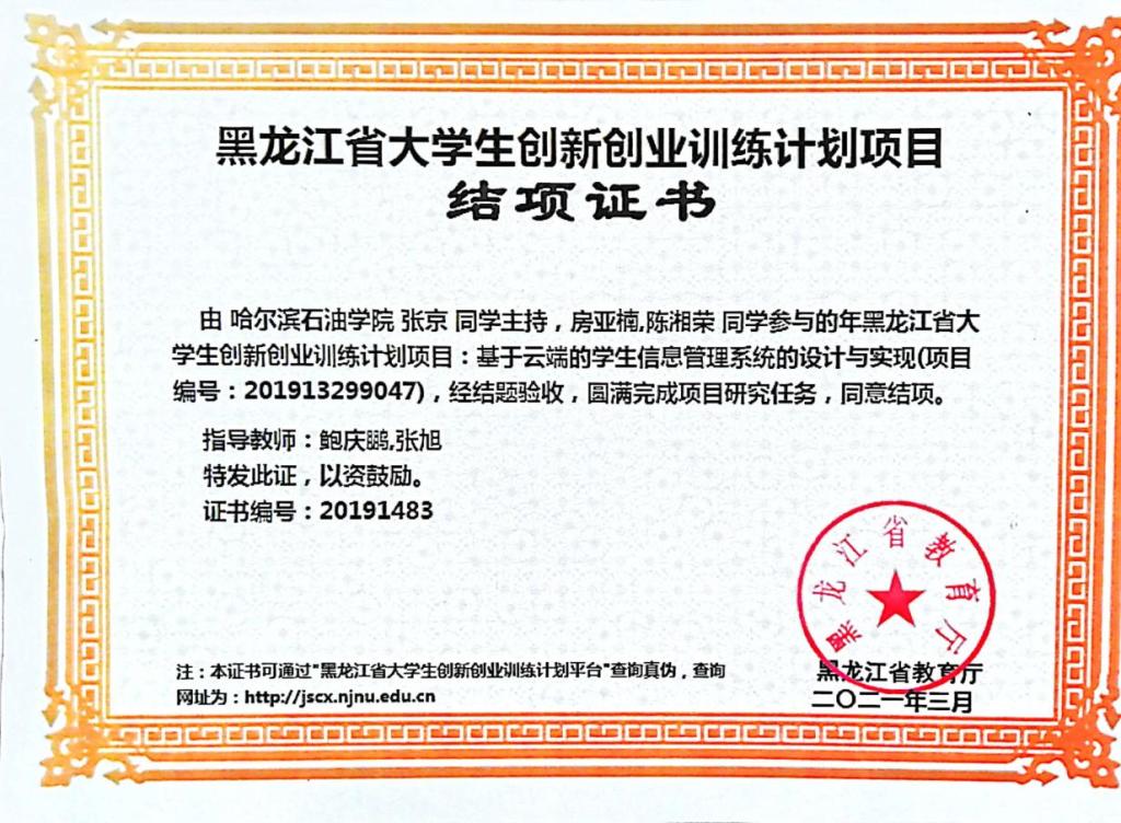 上一条:黑龙江省大学生创新创业训练计划项目《基于“互联网+”的线上试衣间系统的研究与实践》(2021.03) 下一条:黑龙江省大学生创新创业训练计划项目《基于小程序的停车位预约系统》(2022.08)