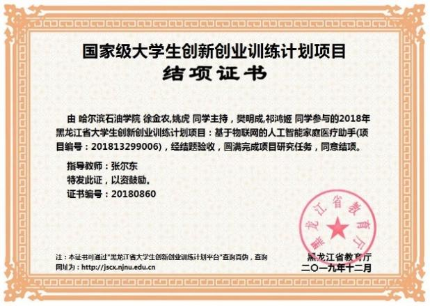 国家级大学生创新创业训练计划项目《基于物联网的人工智能家庭医疗助手》(2019.12)