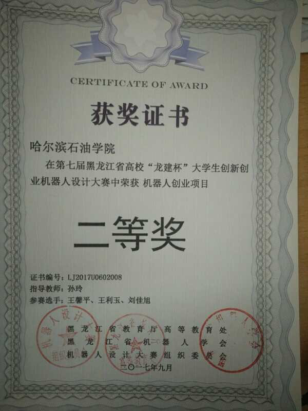 第七届黑龙江省高校“龙建杯”大学生创新创业机器人设计大赛-机器人创业项目-省级二等奖(2017.9)