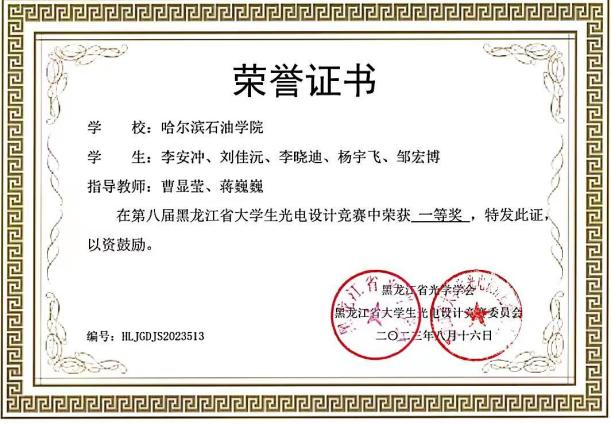 第八届黑龙江省大学生光电设计竞赛省级一等奖(2023.08)