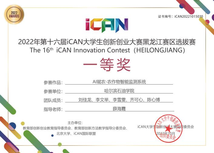 第十六届iCAN大学生创新创业大赛黑龙江省赛区一等奖(2022.10)