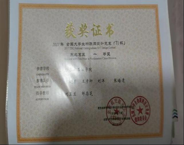 2017年全国大学生物联网设计大赛东北赛区二等奖(2017.07)