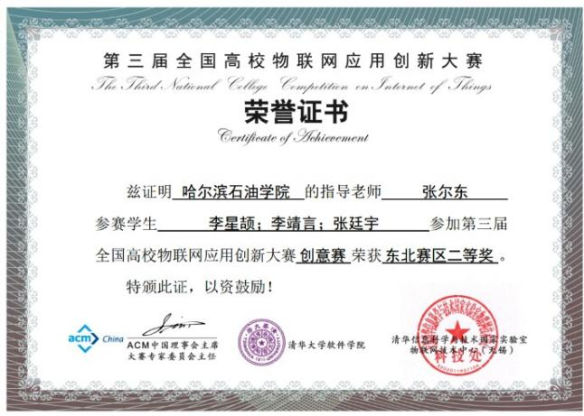 第二届全国高校物联网应用创新大赛东北赛区二等奖(2015.04)