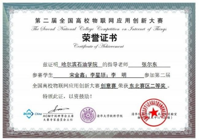 第二届全国高校物联网应用创新大赛东北赛区二等奖(2015.04)