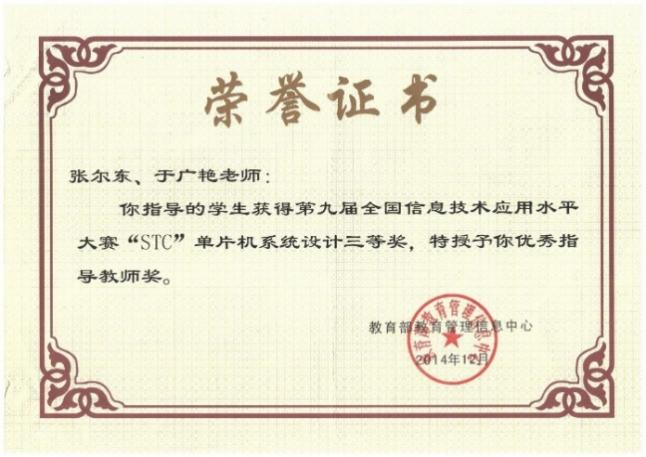 第九届全国信息技术应用水平大赛“STC”单片机设计国家级三等奖(2014.12)