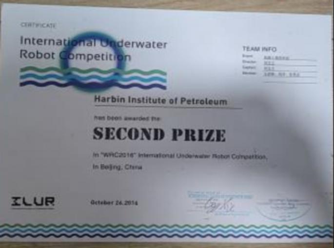 2016国际水中机器人大赛中国区二等奖(2016.10)