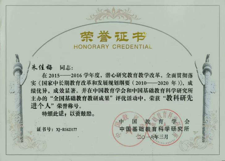 朱佳梅 全国基础教育教研成果教科研先进个人 2016.03