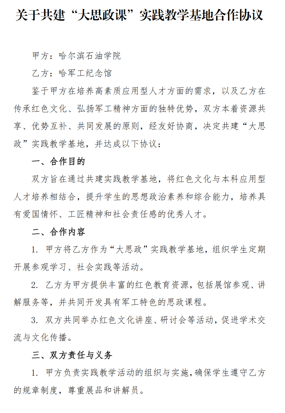 哈军工纪念馆校外实践教学基地合作协议