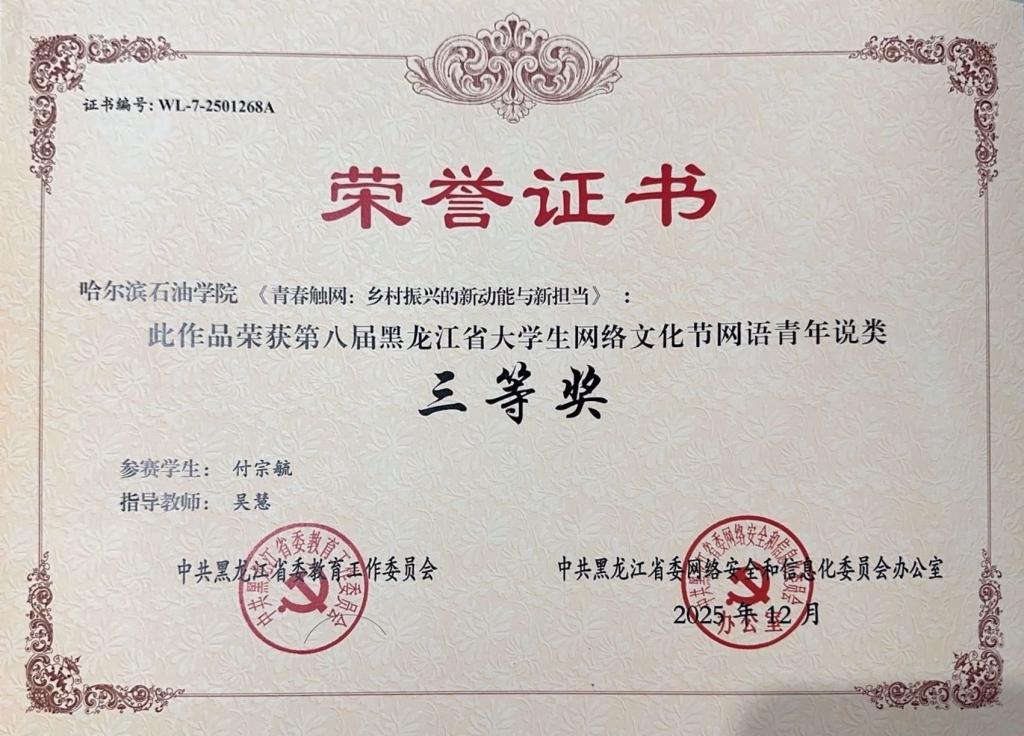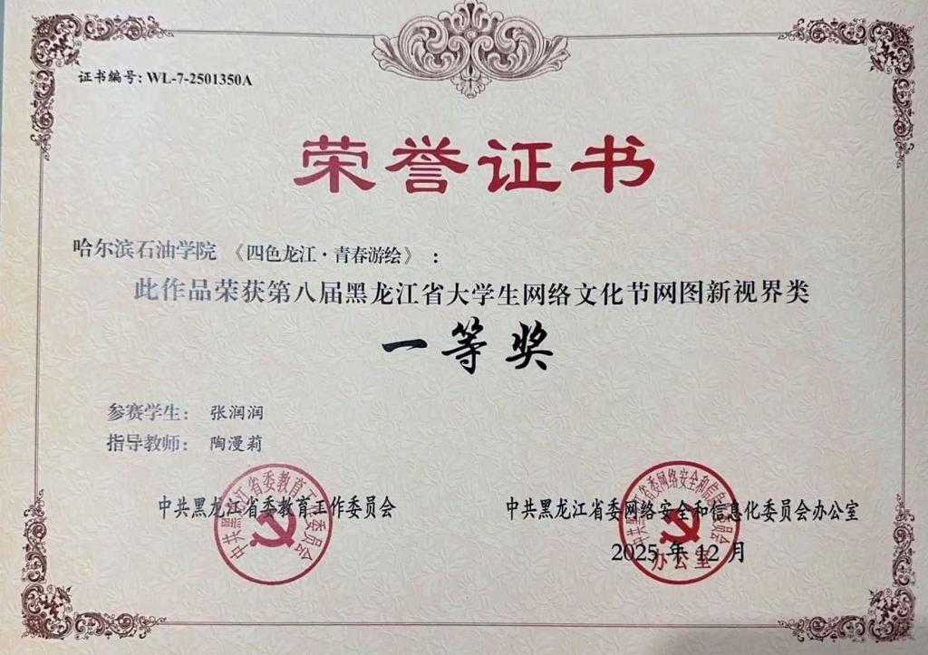 近日,由黑龙江省委教育工委、省委网信办联合主办的“第八届黑龙江省大学生网络文化节”和“第八届黑龙江省高校网络教育优秀作品推选展示活动”获奖名单正式揭晓。马克思主义学院陶漫莉老师指导学生张润润的作品《四色龙江・青春游绘》成功斩获一等奖,吴慧老师指导学生付宗毓的作品《青春触网:乡村振兴的新动能与新担当》获得三等奖。获奖作品均被推荐参加全国评选。