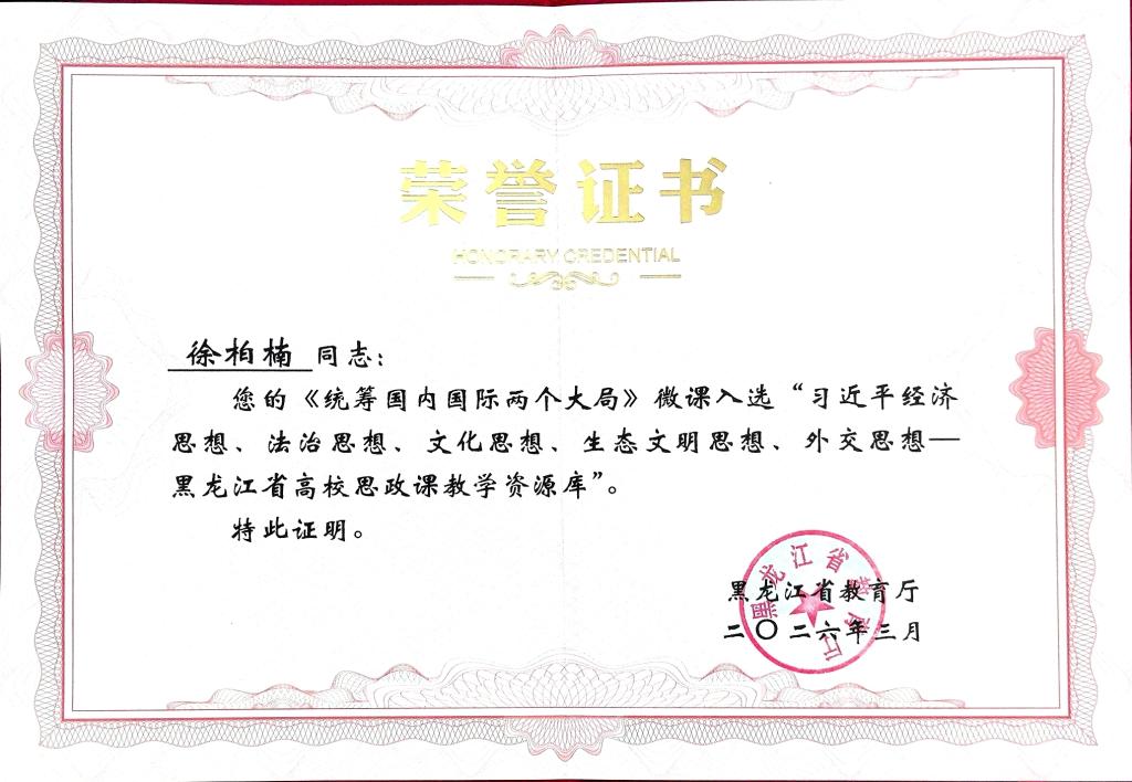 近日,黑龙江省教育厅公布了最新一批高校思政课教学案例库入选名单,我校马克思主义学院教师徐柏楠的微课《统筹国内国际两个大局》入选“习近平经济思想、法治思想、文化思想、生态文明思想、外交思想——黑龙江省高校思政课教学资源库”。