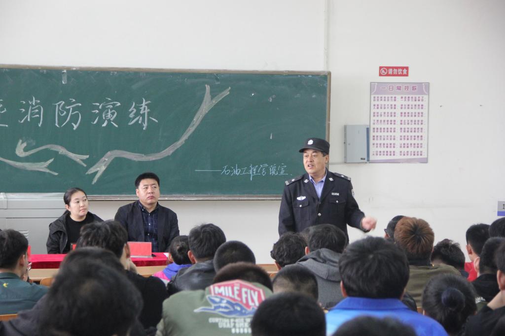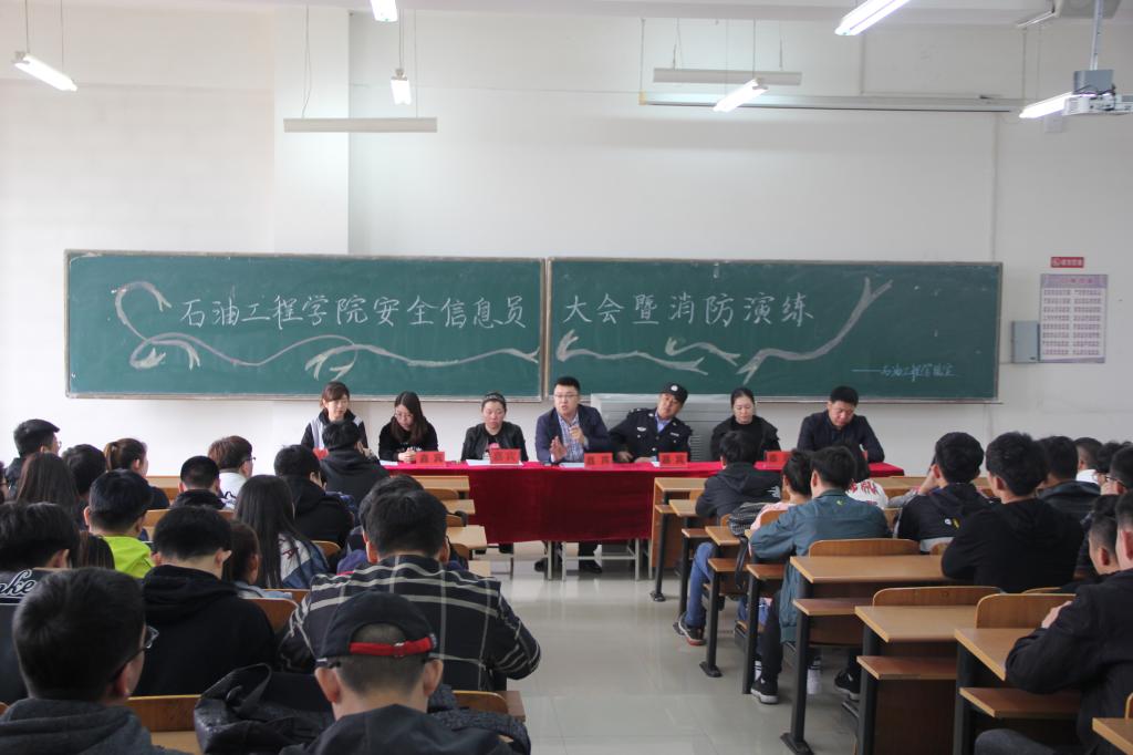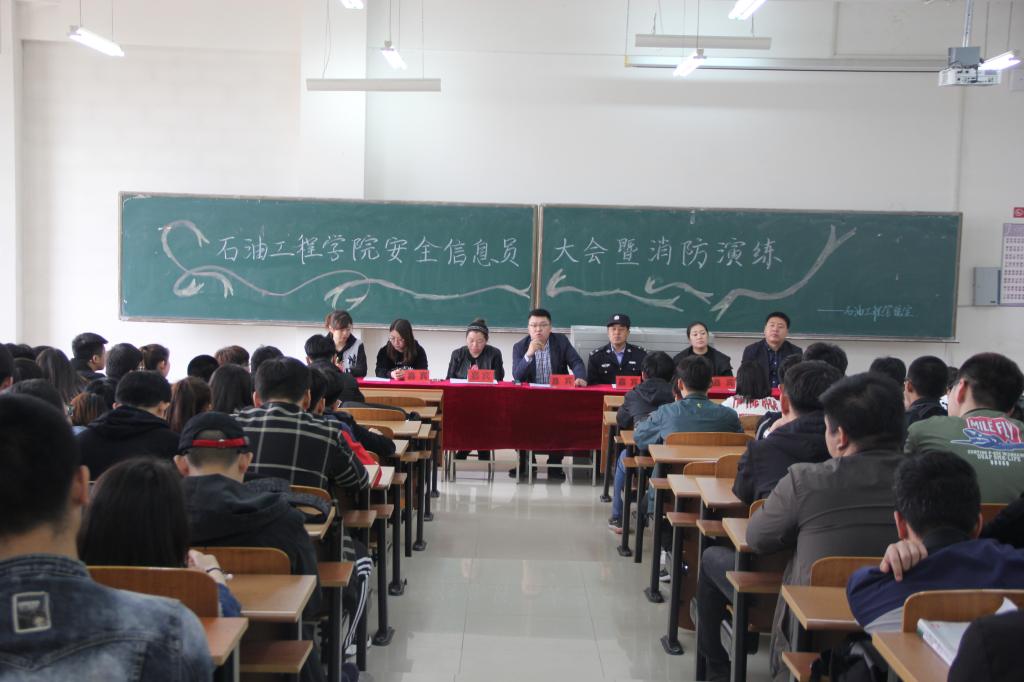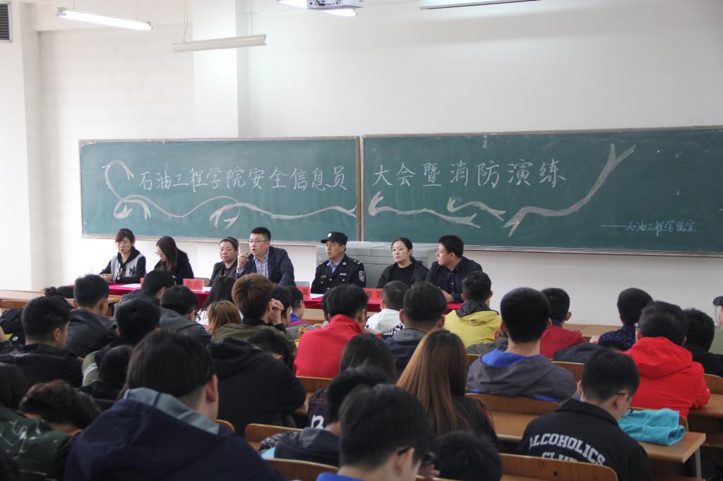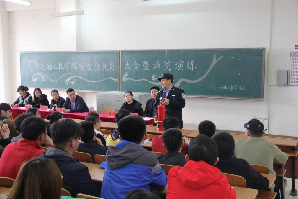 为贯彻落实学校安全工作会议精神,提高全院学生的安全防范意识和面对火灾、地震等突发事件时的疏散与自救能力,维护校园平安稳定。石油工程学院于4月20日中午12点,在主教学楼426教室,召开全院安全信息员大会暨消防演练。院党总支副书记康平军、团总支书记张雪、办公室主任赵昕以及全体辅导员参加了本次大会,校保卫处治安管理科赵胜林老师应邀参加了本次大会。保卫处刁子文处长亲自带队,在疏散现场指导了本次消防演练。
