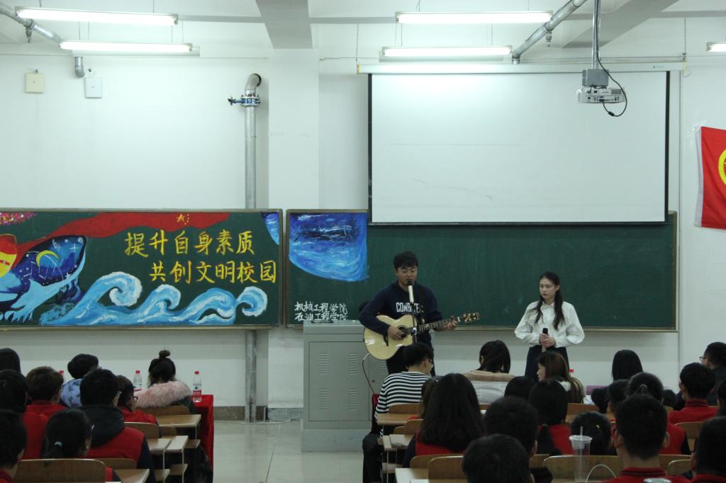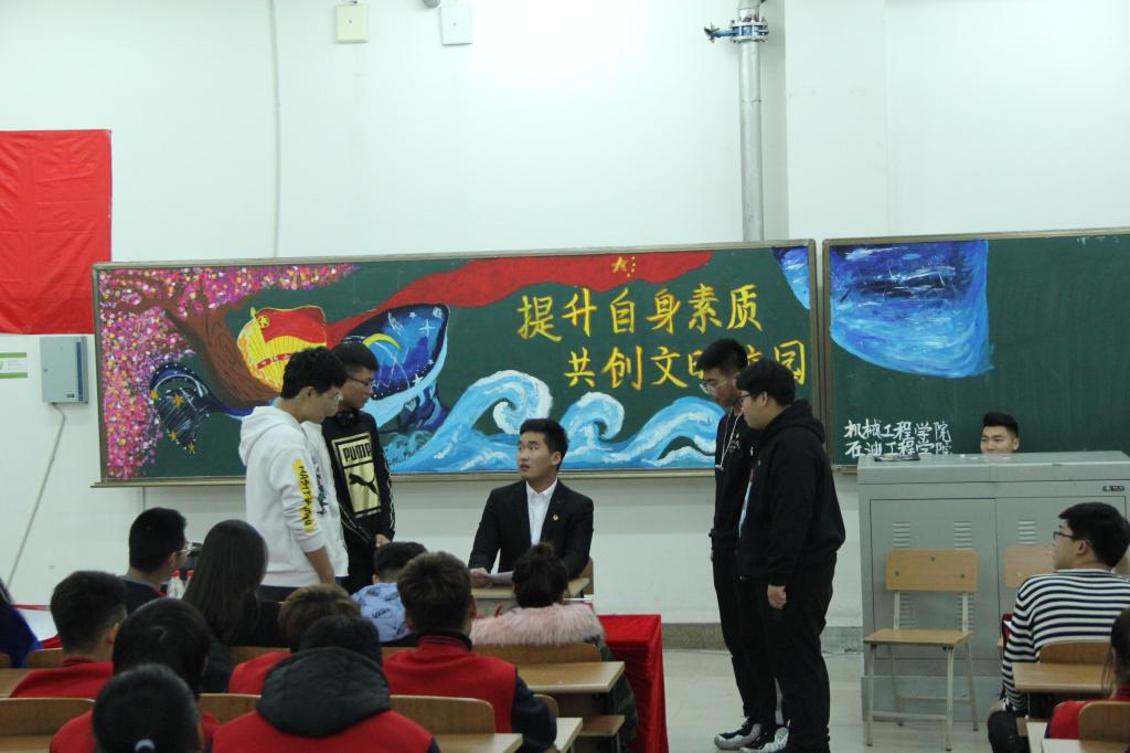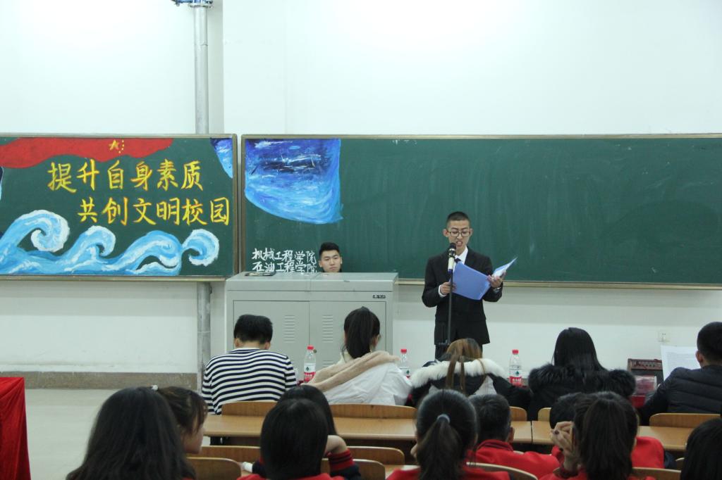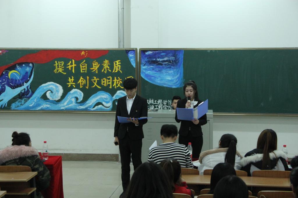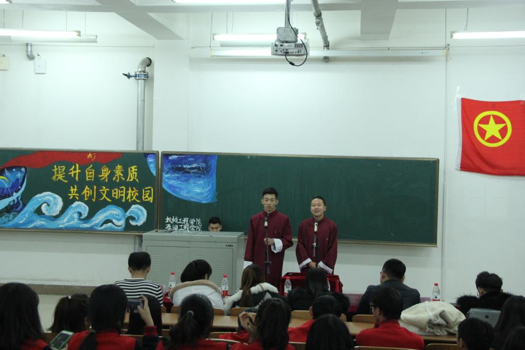 大学生是社会中最积极、最活跃、最有生气的力量。为了给同学们注入一股新的能量,树立文明风尚,引导同学直面青春,志存高远,增长知识,锤炼意志。石油工程学院于11月27日19点05分在主教519开展以“提升自身素质,共创文明校园”为主题的团活大赛。本次团活形式多样,内容新颖,充分表现了石油工程学院学生对本次团活大赛的热情与重视。担任本次团活大赛的评委有:哈尔滨石油学院团委秘书处主席团成员以及各二级学院团总支副书记。