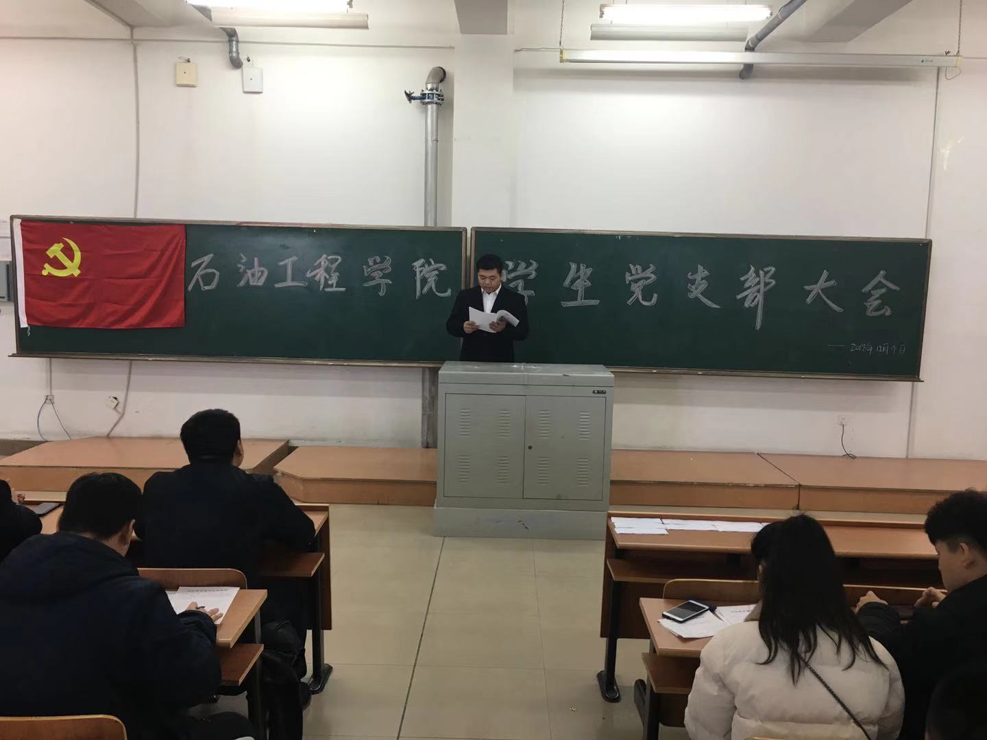 12月4日,石油工程学院学生党支部在519教室召开支部大会,19名党员参加了会议,会议由学生党支部书记王昱主持。会议通过决议,同意接收冯宇等9名同志为中共预备党员。