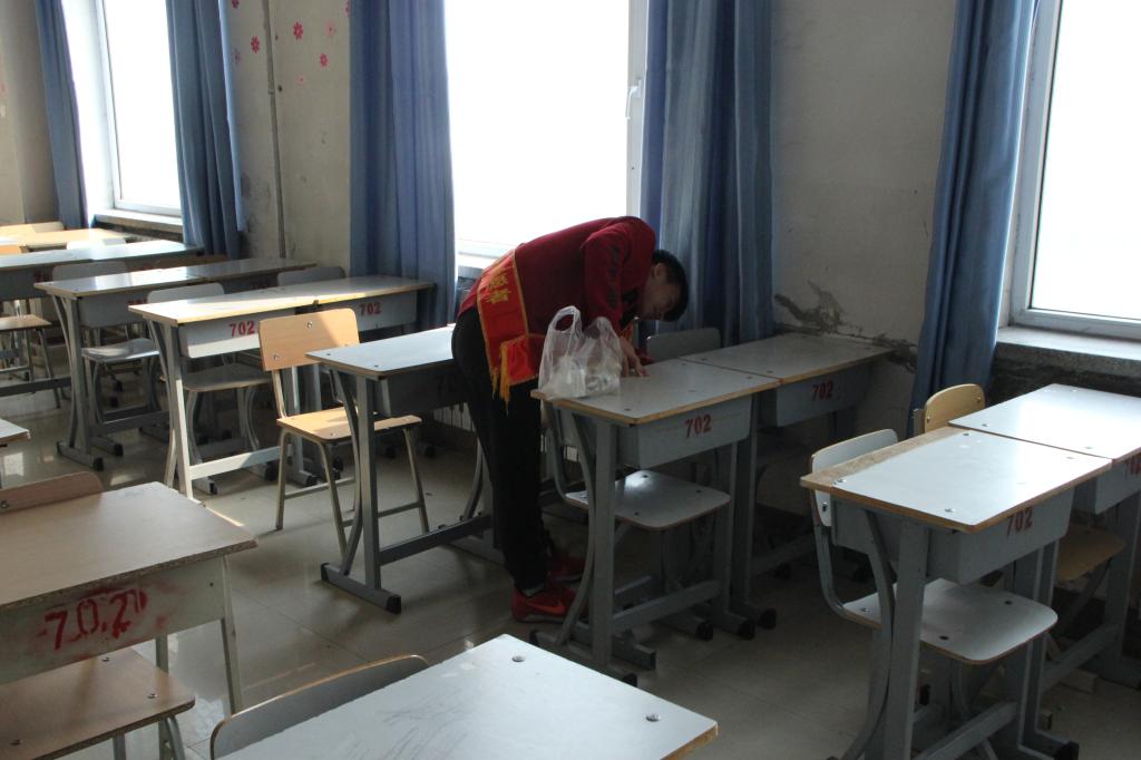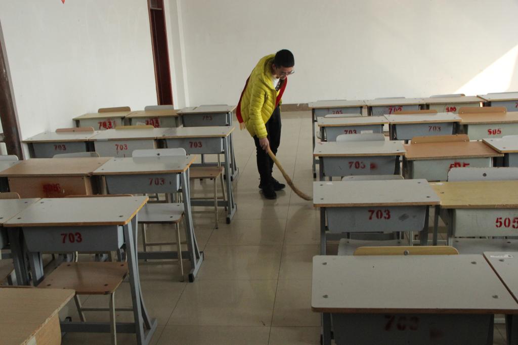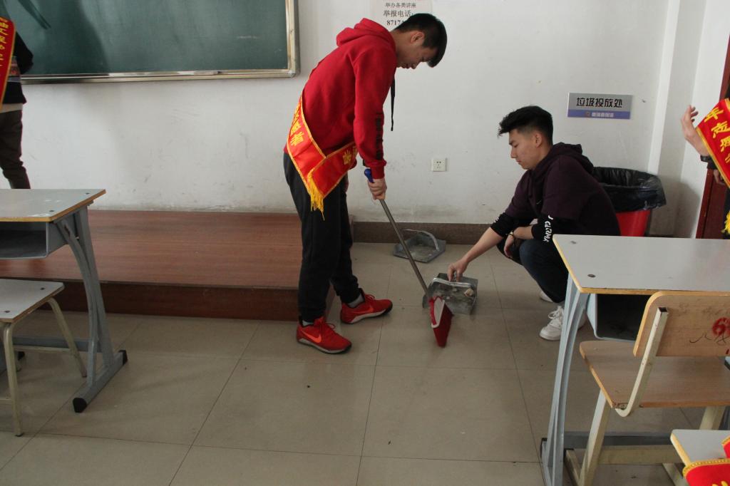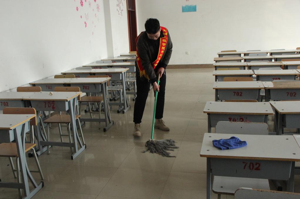 部分学生会成员在团总支副书记刘雨薇,学生会副主席刘以航的带领下,对教室内的门窗、墙壁、地面、课桌椅进行了彻底的扫除和清理,在大家齐心协力的合作下,将清扫工作圆满完成。