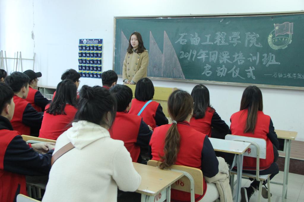 此次开班式由石油工程学院团总支书记张雪主持,由各年级团支部成员与分团委部分成员参与会议。第一项由石油工程学院团总支副书记刘雨薇带领大家歌唱团歌,在嘹亮的团歌声中,各位同学都明确了自己的态度,树立了自己时刻要一个团员的标准来要求自己的目标。第二项由石油工程学院团总支部书记张雪进行讲话。张雪老师重点强调了相关的学习要求和纪律要求。她希望全体团课成员能积极学习、努力工作、让自己成为一个勤于学习、善于创造、甘于奉献的学生骨干,成为政治立场坚定、品德作风优良、工作业绩突出、努力当好党的助手和后备军。第三项由参与会议的学生代表进行发言。随后张雪老师又为大家介绍了团课培训的日程安排。开班式最后大家合影留念。