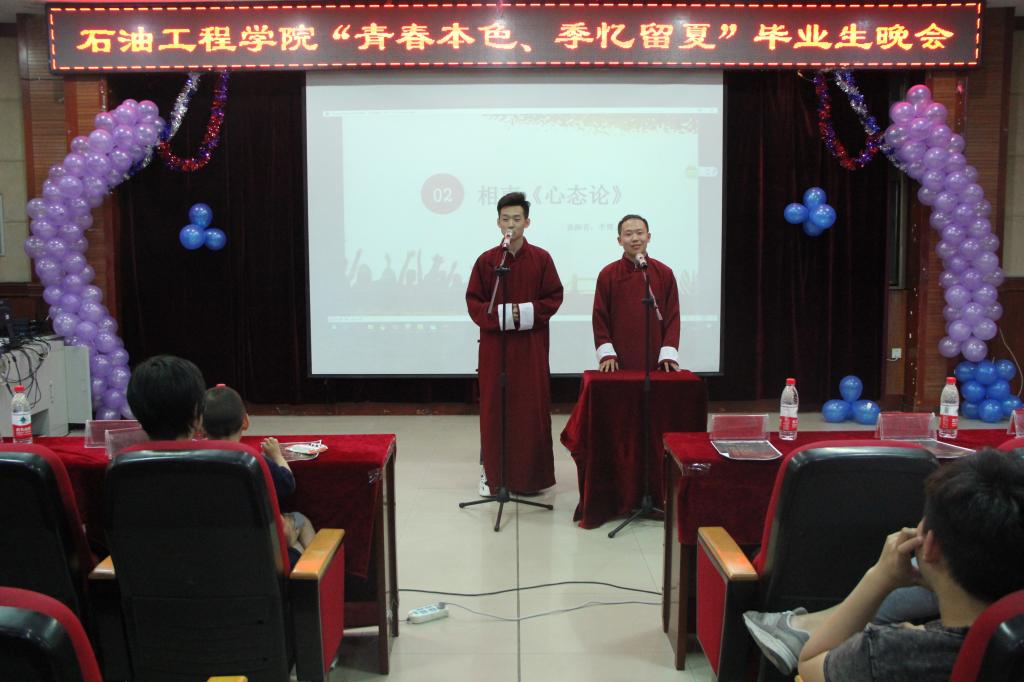 晚会在大屏幕上播放老师们对15级同学的寄语下开始,一句句祝福,一声声叮咛,使同学们感触颇深,与此同时晚会在一片掌声中开始。随后由刘承哲、梁诗悦为我们带来的歌曲《天下》,很快带动了场下观众们的热情。紧接着的是荣浩淳和李博的相声《心态论》,大学生艺术团为大家带来舞蹈的《good time》。这些节目都彰显了艺术色彩。回望尽头留下青葱岁月,展望前方不尽似水流年,一首《匆匆那年》勾起了大家对大学生活的无尽回忆,由刘潇,赵德力带来的《石油工程学院新闻联播》更是带大家重温四年里感动的人和事。接下来是由梁诗悦、高俊波、李恩红等带来的小品《大学毕业难》,幽默搞笑的同时却碰触到大家的泪点,老师这个字眼是我们生命中最美好的回忆与永恒的怀念,接下来是由丁娆和柏胜龙带来的歌曲《感谢你曾经来过》。精彩的歌曲过后是由汤闯、陶宝志等人带来的小品《面试》,让大家看到了面试中的各种风波。最后是由贾凯霖带来的rap《想把你留在这里》。弹指一挥间,四年的大学生活就唱起了完结篇。在此次晚会的最后,2015级辅导员于洪峰老师首先祝贺所有毕业生顺利毕业,并希望他们能够不忘初心砥砺前行,在今后的道路上不畏艰难努力下去,天下无不散的筵席,四年的师生情朋友情将会伴随着他们一路成长。