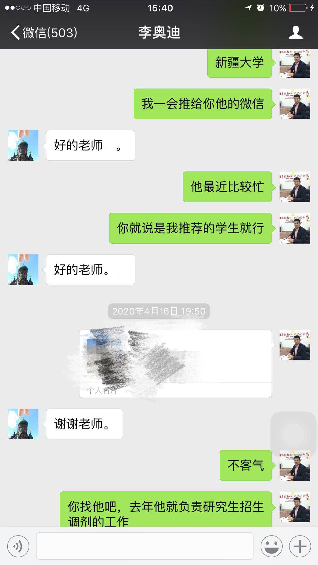 16级储运学生陈兴元考研初试287分,在等待国家线时心情焦躁,油气储运专业系主任朱砂老师帮助其进行了分析,为其联系了所报学校辽宁石油化工大学的专业导师,使得学生明确方向,调整好心态!由于疫情影响,学生在家没有复试的复习书和资料,朱老师将复习资料整理好发给学生,学生有问题都可以随时联系解答,帮助他准备复试!