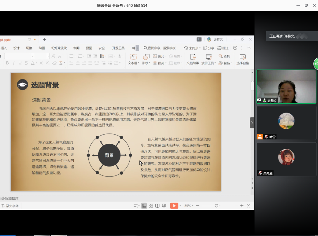 为保障正式答辩的顺利进行,预答辩模拟真实答辩流程,以更严格的评价标准和要求进行预演。油气储运工程系的每一位指导教师,认真聆听了每位毕业设计学生的答辩过程,对学生在网络平台使用PPT制作技巧和演讲表达方式等方面进行了指导,帮助学生发现自己论文撰写和PPT制作,以及对研究内容理解中存在的问题,并在正式答辩前能够及时得到改正,以确保每位学生都可以顺利完成在线答辩。本次预答辩,通过腾讯会议软件直播进行,每位同学有10-15分钟的时间进行PPT讲解,随后指导教师进行一对一的评价与指导。