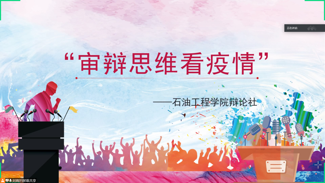 为提高同学们的思辨能力和辩论口才,丰富疫情期间的社团文化生活,用辩论的思维方式向更多的同学传达有关疫情的知识。值我校第七届社团文化艺术节期间,石油工程学院辩论社团于5月26日晚18:00成功举办以“审辩思维看疫情”为主题的线上辩论赛。