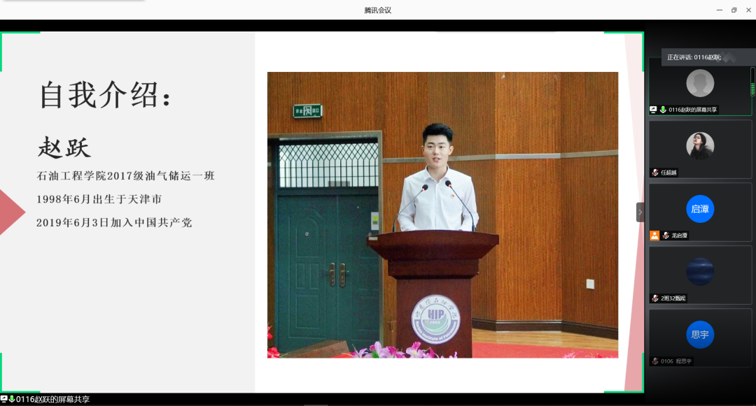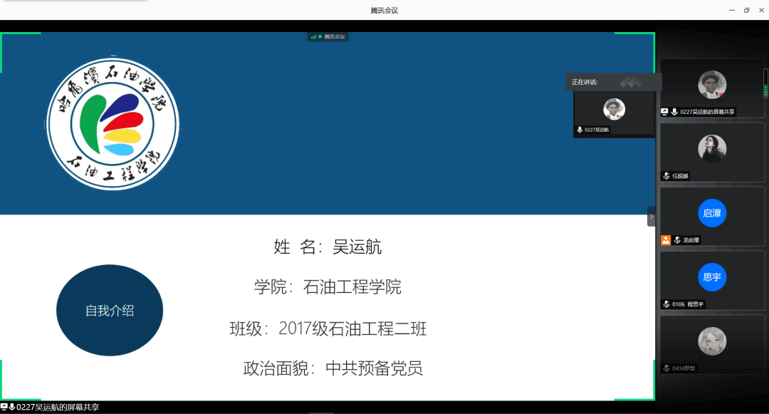 党支部书记王昱同志表示在这场抗击疫情的战斗中,石油工程学院学生党支部的各位同志,表现突出,有10余名党员同志投身到社区志愿抗疫服务工作中。无论是在抗疫志愿服务工作中,还是在钉钉填报、线上学习等日常工作中,各位学生党员都起到了带头作用。她希望各位学生党员,继续努力,牢记党员身份,不辱使命担当。