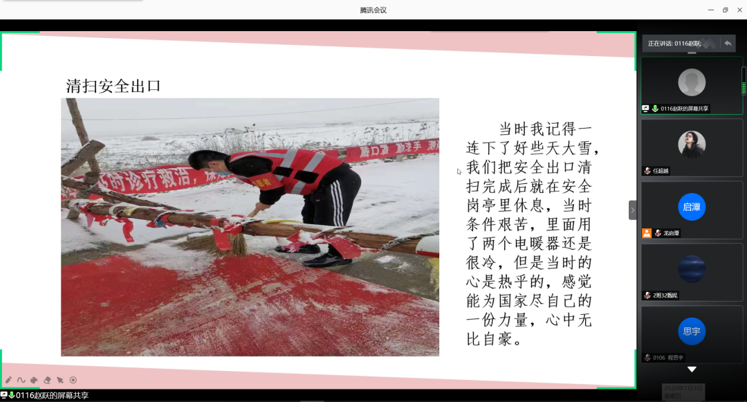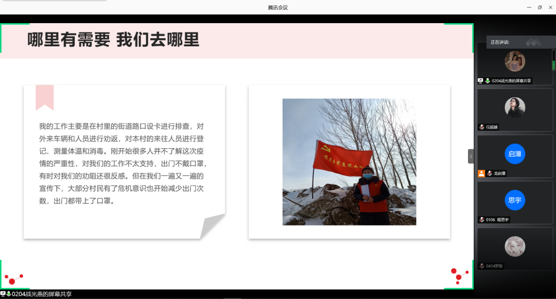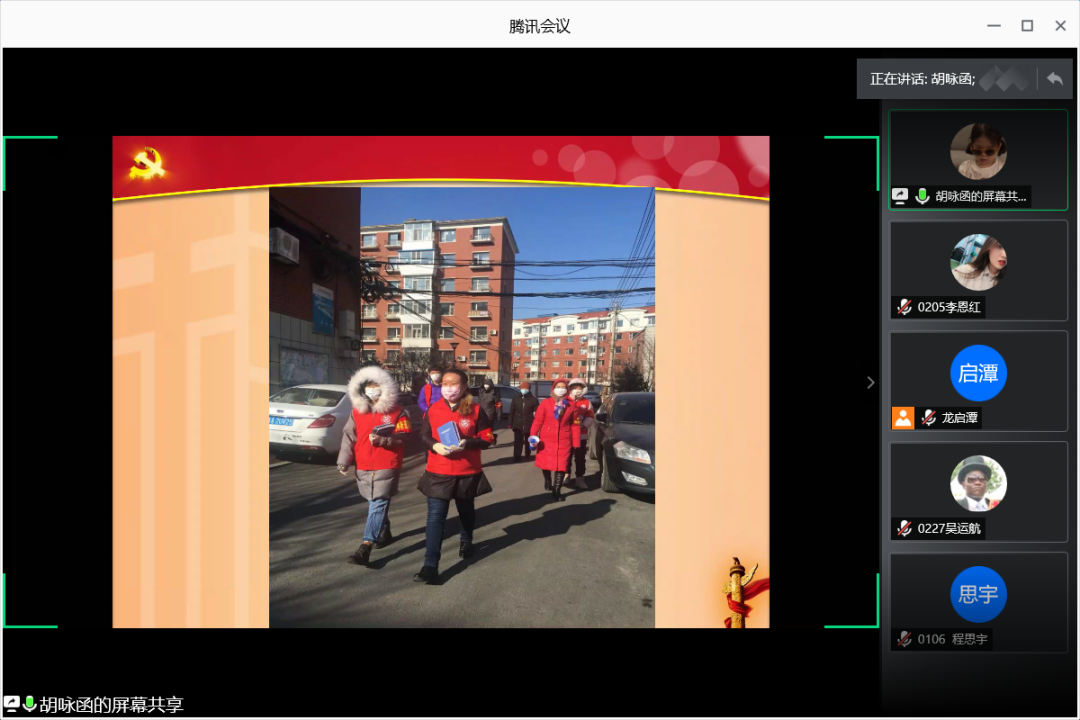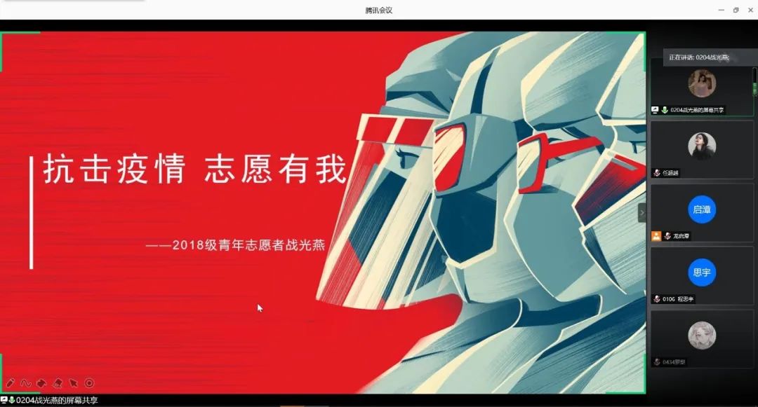 会上,胡咏函、战光燕、吴运航、赵跃四位同志,分享了自身在疫情期间的志愿服务经历。他们的事迹感动了与会的每一位同志,正是有这些“平凡”的付出,我国的疫情防控才能在最短时间内取得阶段性胜利。他们用实际行动彰显了学生党员的责任和担当!党支部内其余同学,也分别在微信群内分享了自己疫情防控工作中的所感所闻。